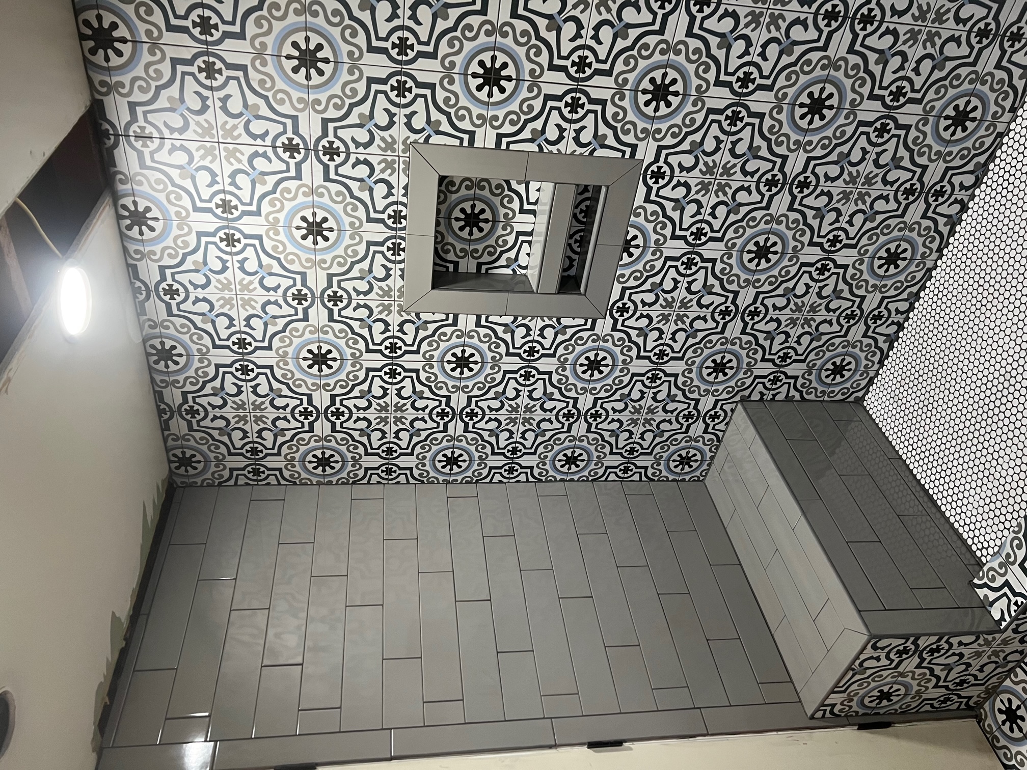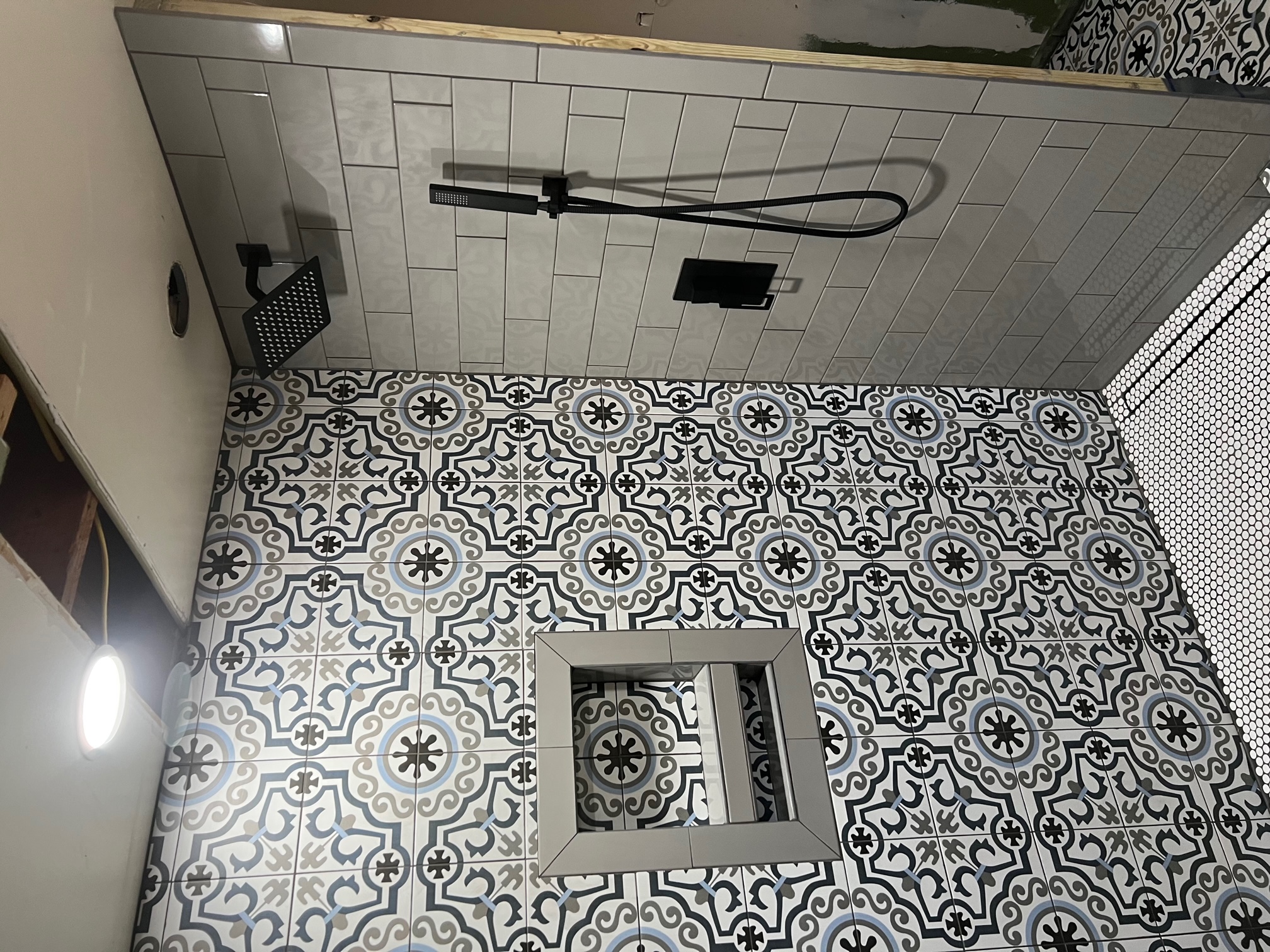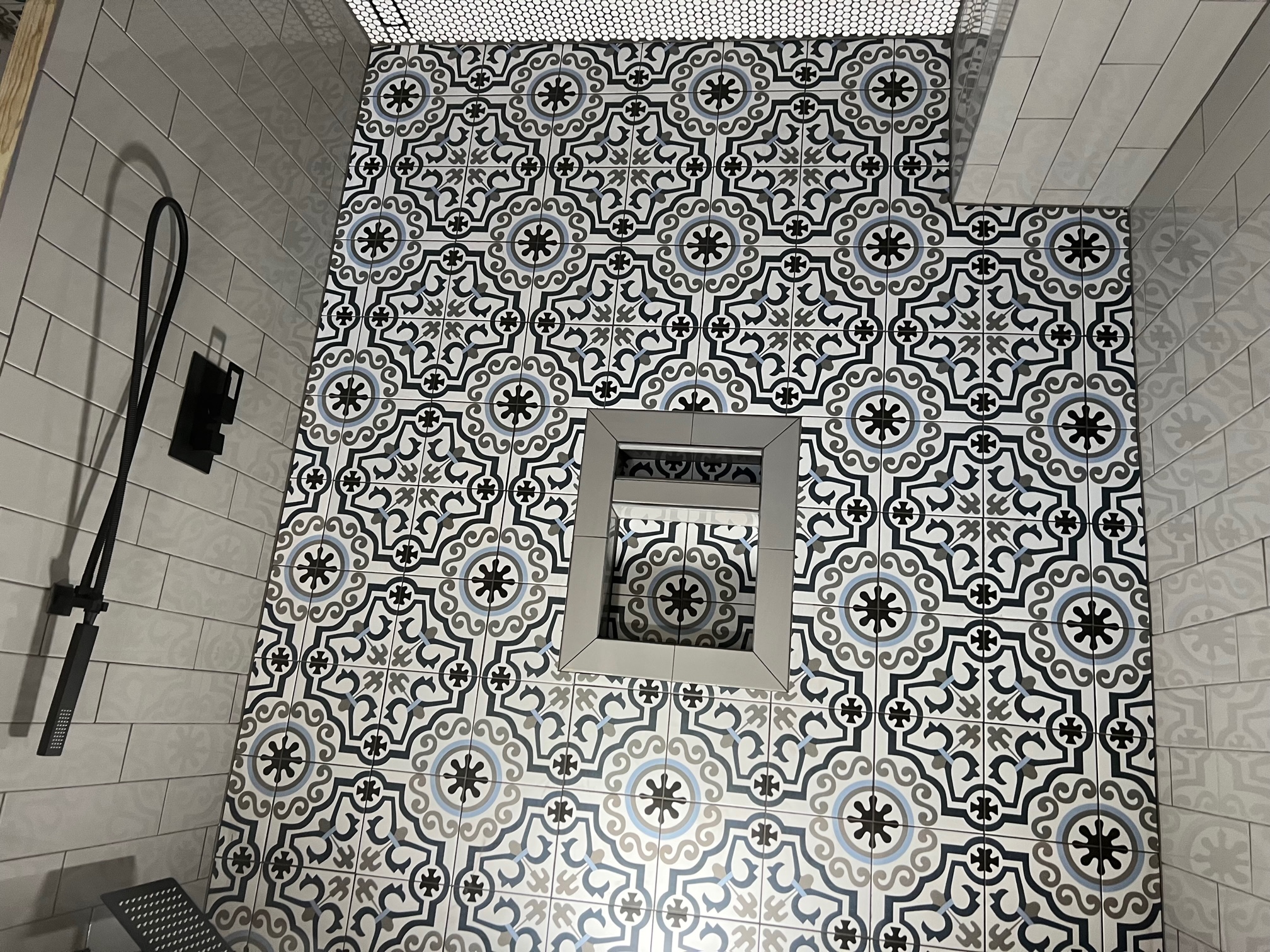 This cold bathroom was created using custom tile and our client was beyond happy with the end result.