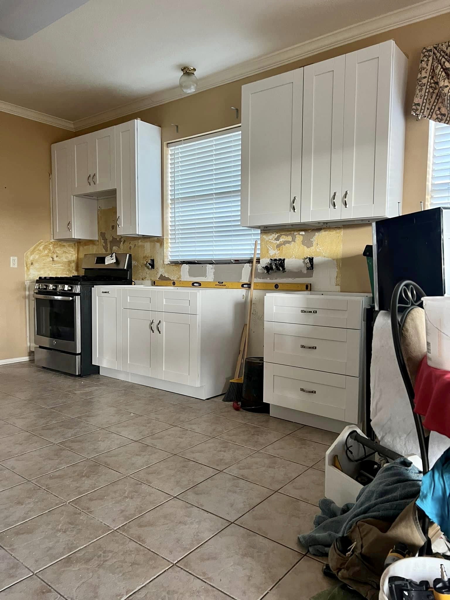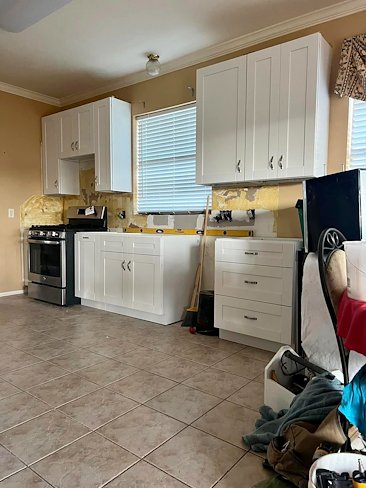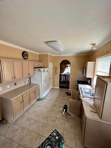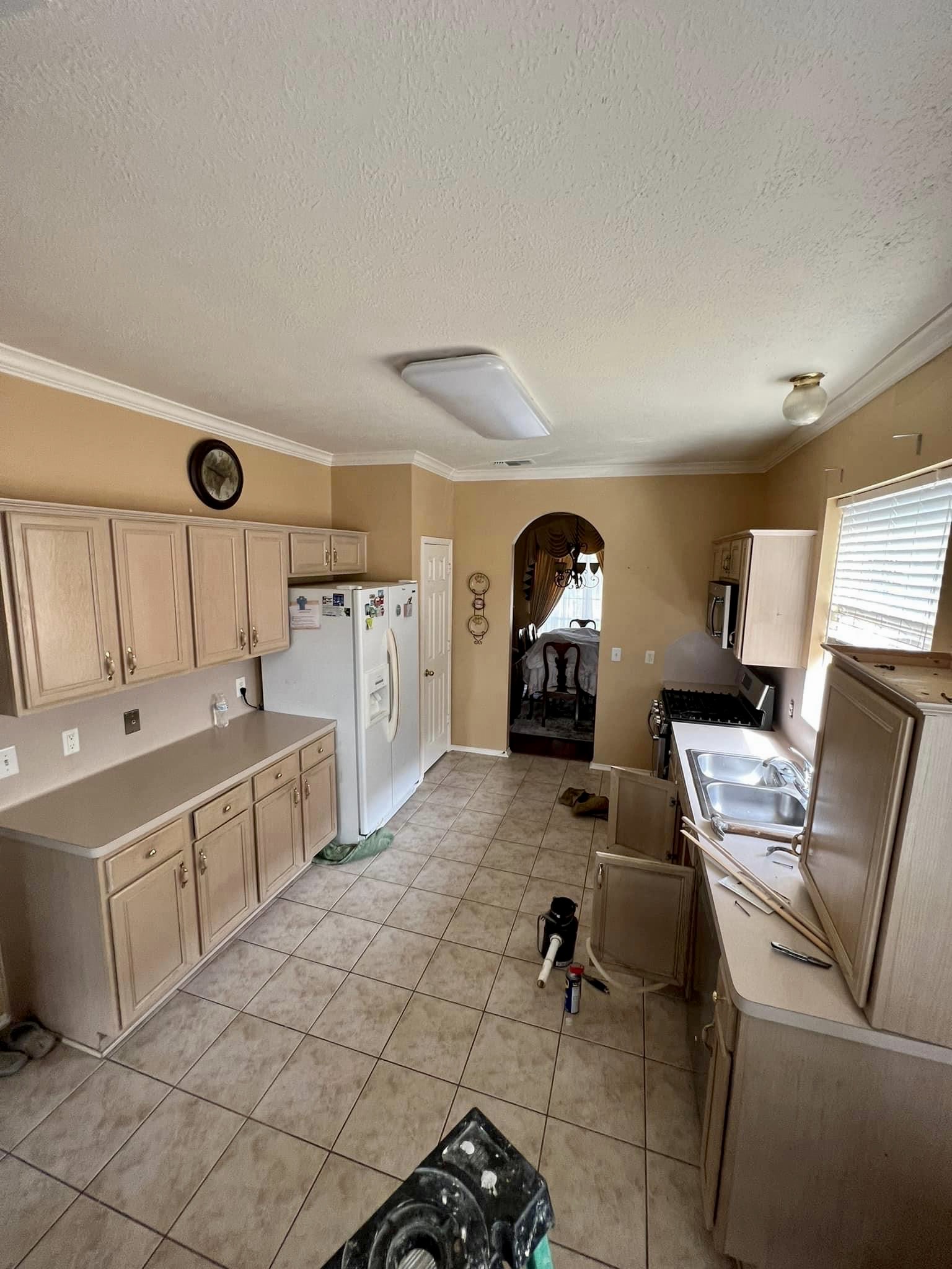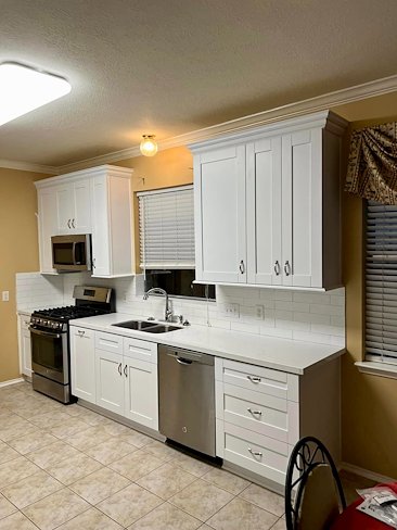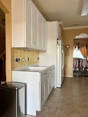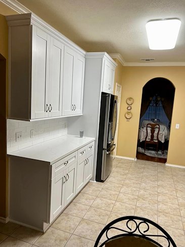 Our clients wanted to update their kitchen on a budget. To do this, we replaced the existing cabinetry with shaker style upper and lower cabinets. We framed the refrigerator with a custom box and painted the cabinets white. We updated the back-splash with modern white tile and put in a beautiful white stone counter-top.