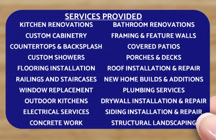 We offer a variety of interior and exterior residential and commercial construction and renovation services. Don’t see your desired service listed? Give us a call or send us an e-mail today to see if we can help you out on your next home or office renovation project.